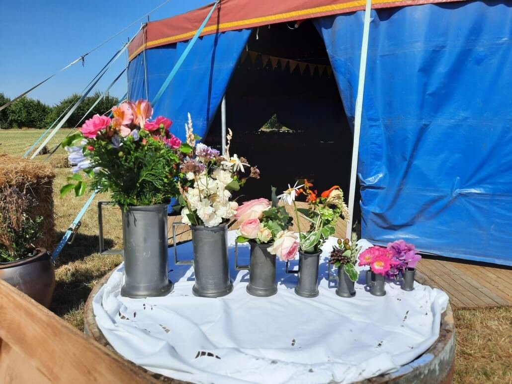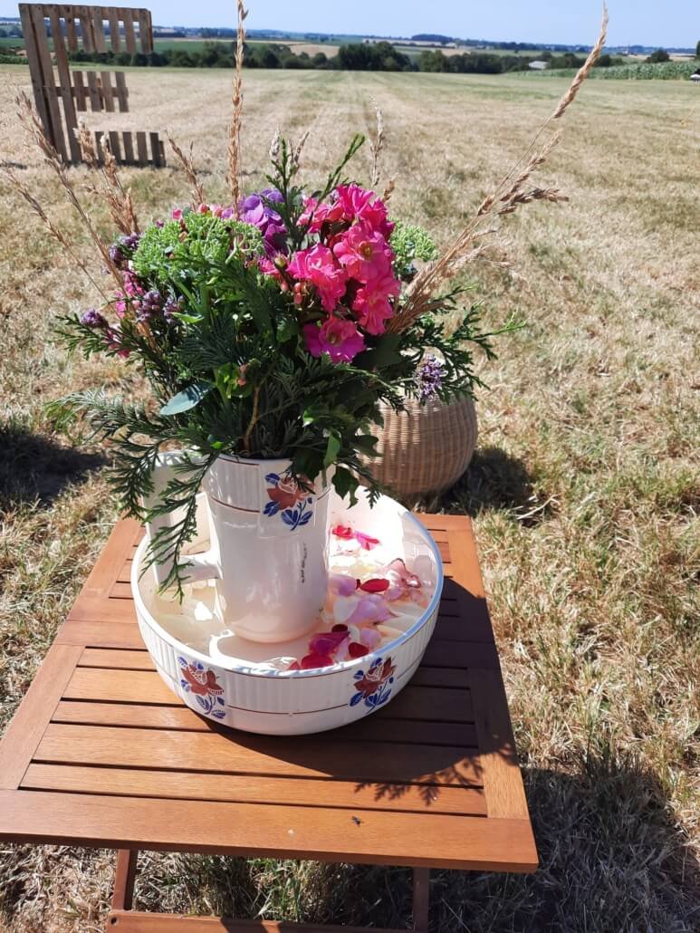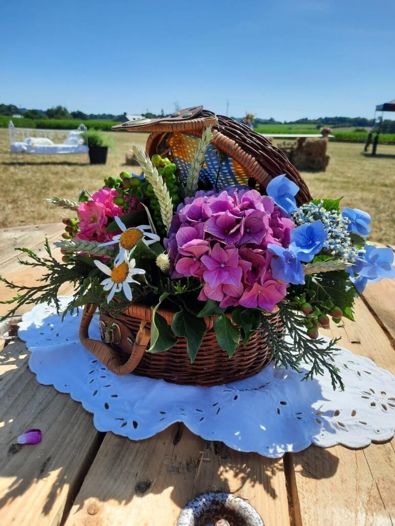 Pour le mariage de Amandine et Régis au pays de Fougères (35) en juin 2022, j’ai composé chaque arrangement floral à partir de fleurs fraîchement cueillies par mes soins avec un thème champêtre ginguette pour une décoration authentique, naturelle et pleine de fraîcheur.